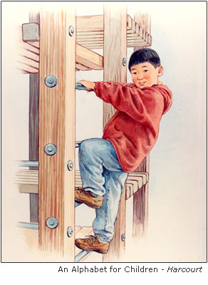 The thing I love most about illustrating textbooks for children is finding and painting the connection between the characters. A lot of textbook illustration involves fairly specific guidelines. Frequently the story line has already been written, and the editors have decided on the style that they want from a portfolio of Illustrators. So the chosen Illustrator has to make the characters come to life within parameters that have already been established and consistently maintain that style of illustration throughout the book. |